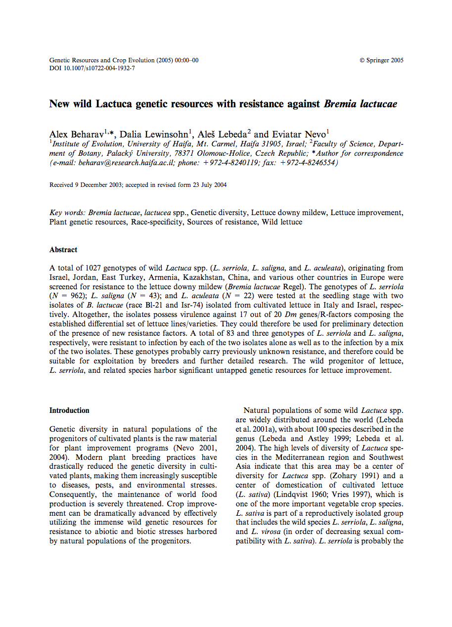 A total of 1027 genotypes of wild Lactuca spp. (L. serriola, L. saligna, and L. aculeata), originating from Israel, Jordan, East Turkey, Armenia, Kazakhstan, China, and various other countries in Europe were screened for resistance to the lettuce downy mildew (Bremia lactucae Regel). The genotypes of L. serriola (N = 962); L. saligna (N = 43); and L. aculeata (N = 22) were tested at the seedling stage with two isolates of B. lactucae (race Bl-21 and Isr-74) isolated from cultivated lettuce in Italy and Israel, respectively. Altogether, the isolates possess virulence against 17 out of 20 Dm genes/R-factors composing the established differential set of lettuce lines/varieties. They could therefore be used for preliminary detection of the presence of new resistance factors. A total of 83 and three genotypes of L. serriola and L. saligna, respectively, were resistant to infection by each of the two isolates alone as well as to the infection by a mix of the two isolates. These genotypes probably carry previously unknown resistance, and therefore could be suitable for exploitation by breeders and further detailed research. The wild progenitor of lettuce, L. serriola, and related species harbor significant untapped genetic resources for lettuce improvement.